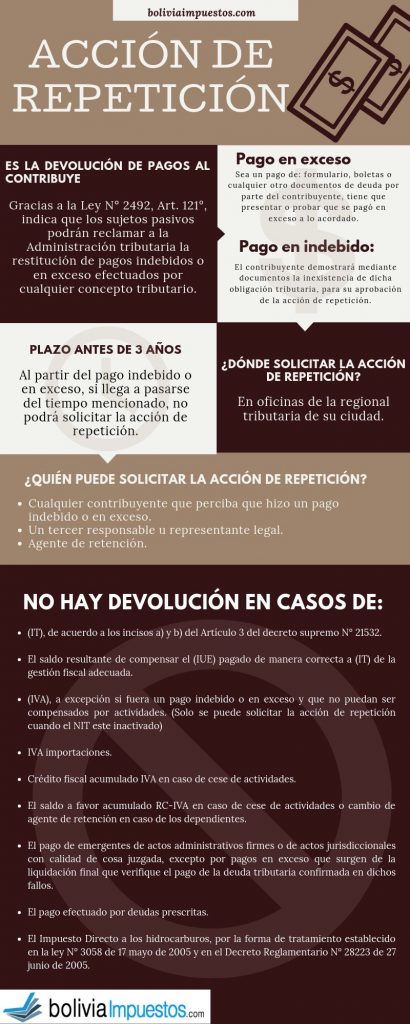 La Ley Nº 2492, Art. 121º, establece que la acción de repetición es aquella que pueden utilizar los sujetos pasivos para reclamar a la Administración Tributaria la restitución de pagos indebidos o en exceso efectuados por cualquier concepto tributario.
