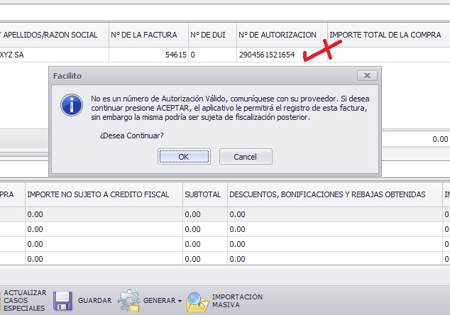 En caso de que no tengamos facturas masivas mayores a 1000 registros, al insertar datos regularmente sin usar el botón de importación masiva, vamos a digitar un número de NIT o Nro de Autorización inválido, y nos aparecerá el siguiente diálogo