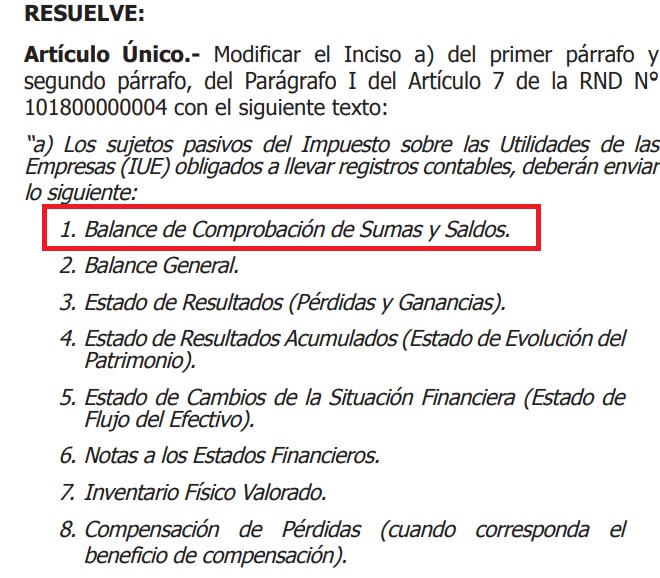 El SIN ha modificado la RND 101800000004 de presentación de Estados Financieros, incorporando como nuevo requisito obligatorio la presentación del Balance de Comprobación de Sumas y Saldos con la nueva RND 102400000040 del 27 de dic. 2024.