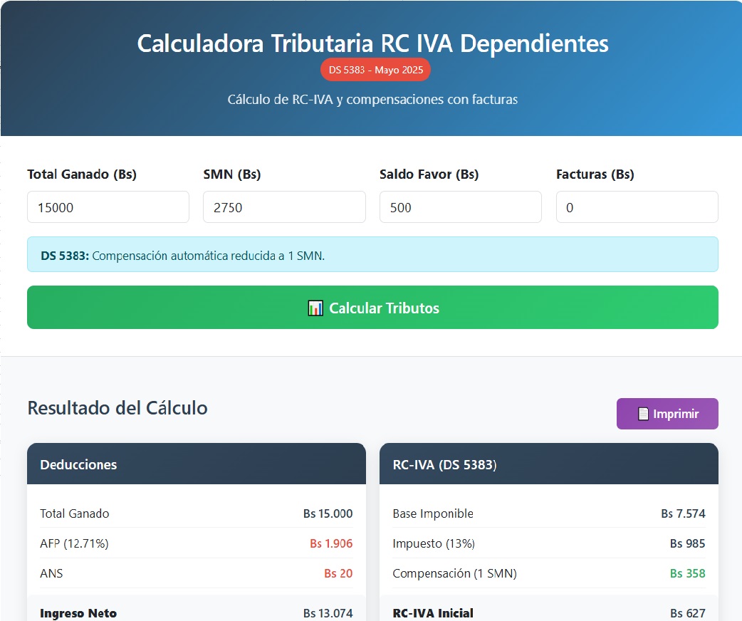 - De enero a abril de 2025, los contribuyentes todavía podían utilizar la compensación automática del 13% sobre 2 SMN (aunque ya con el nuevo SMN de Bs 2.750).