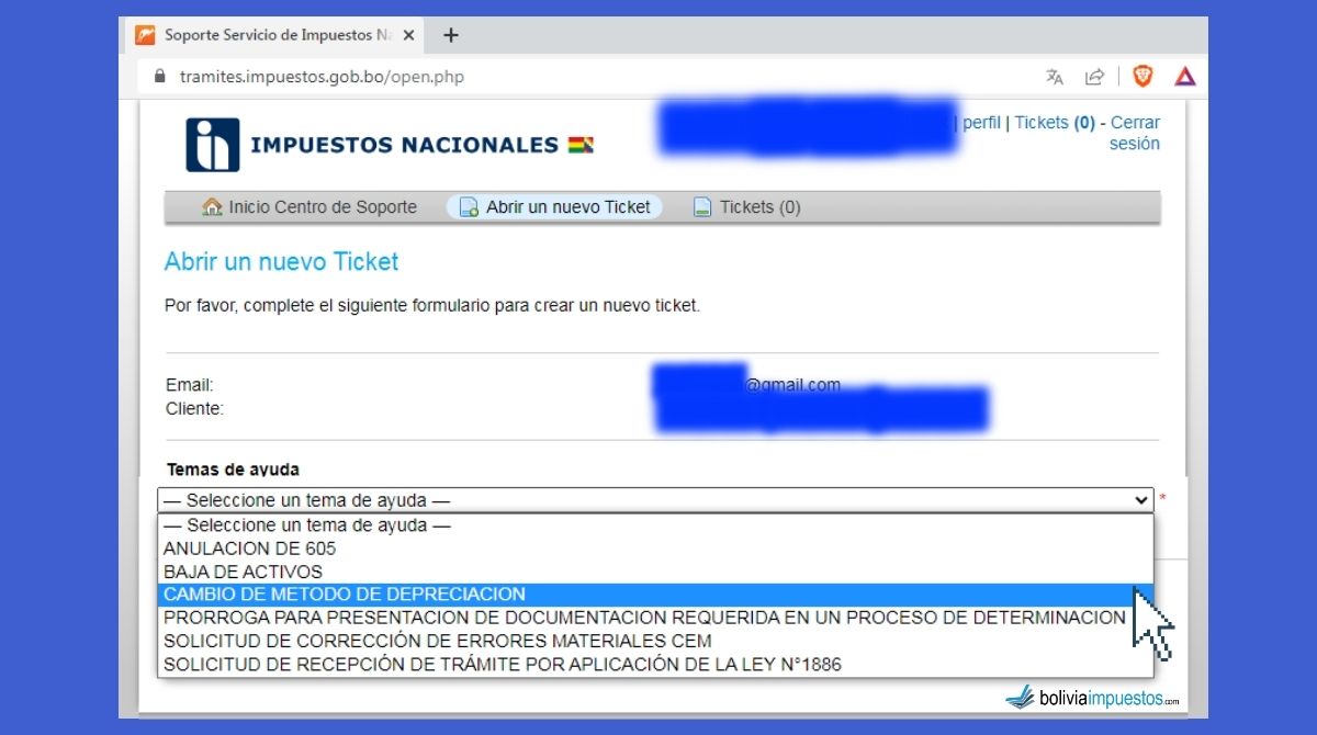 Al acceder a «Trámites y Servicios en línea», encontrarás una opción que dice «Abrir un nuevo ticket». Haz clic en esta opción para iniciar el proceso de cambio de método de depreciación. Esta será tu vía para comunicarte con el SIN y realizar la solicitud correspondiente.