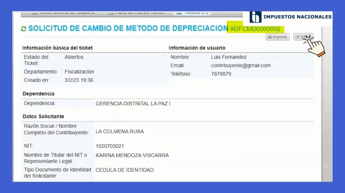 Una vez que hayas completado todos los campos y adjuntado los archivos necesarios, selecciona la opción «Crear ticket» para enviar tu solicitud al SIN. El sistema generará automáticamente una solicitud de cambio de método de depreciación y te proporcionará un número de ticket que podrás imprimir para tus registros.