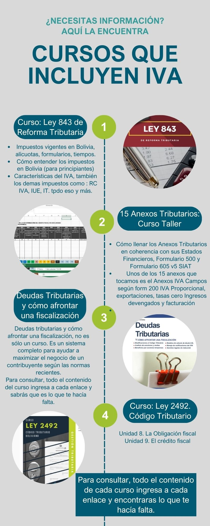 Sobre los cursos, son online y están orientados desde la práctica y siempre citando el respaldo en la norma. Aquí la lista de precios e inscripción online: https://boliviaimpuestos.com/precios-e-inscripciones/