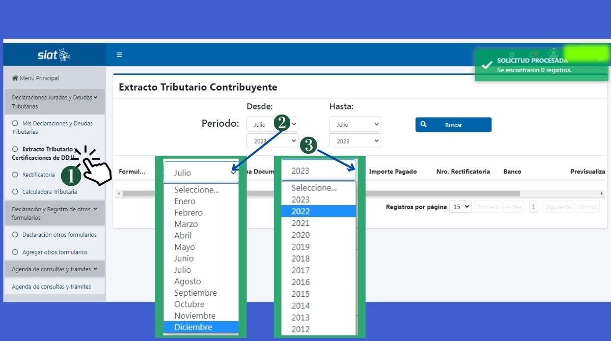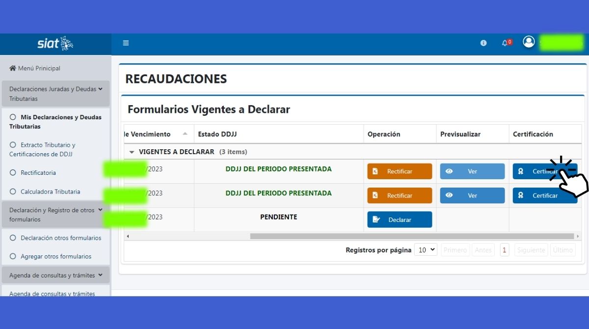 | – Para formularios de períodos pasados: busca el extracto tributario y certificaciones de DDJJ, selecciona el período y certifica el formulario antes de imprimirlo. |