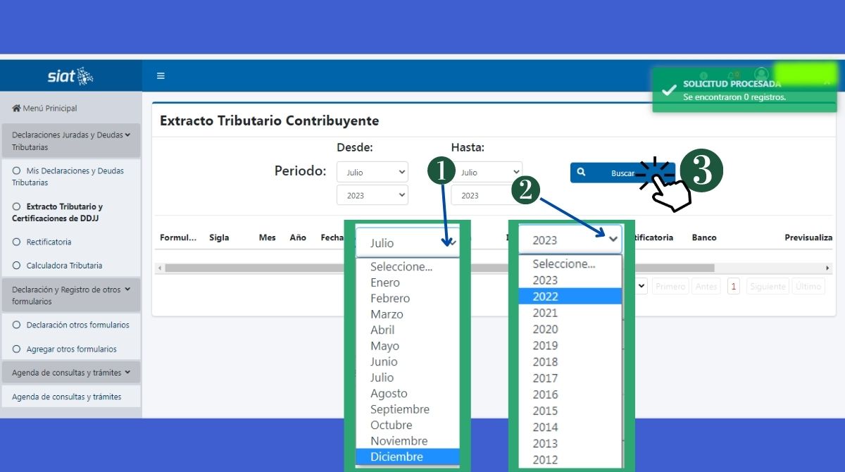 - Luego, en el campo Período en «Hasta», introduce el mes y año hasta el cual deseas ver los formularios.