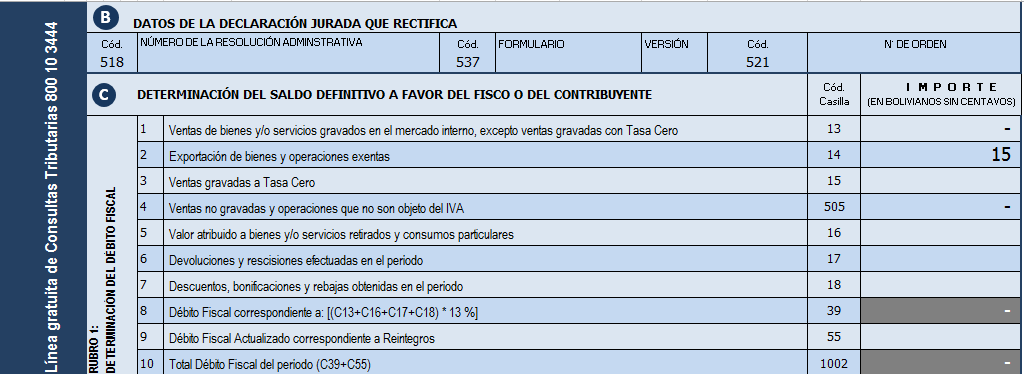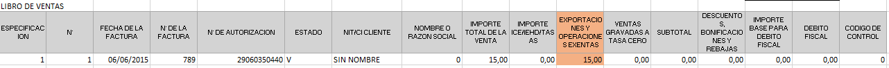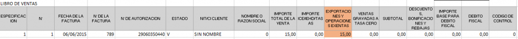 Cuando hacemos el llenado del libro de ventas de la Factura de Artistas como como es sin derecho a crédito fiscal, no podemos apropiarnos de ese monto así que lo que hacemos en el llenado es colocar el monto total de la factura en la casilla que dice «EXPORTACIONES Y OPERACIONES EXENTAS» y nuestro débito fiscal quedará en cero como se encuentra en la imagen.