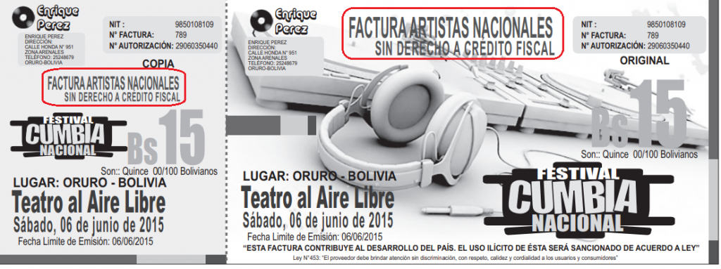 - La Leyenda de «FACTURA ARTISTAS NACIONALES» y como un subtitulo «SIN DERECHO A CRÉDITO FISCAL»