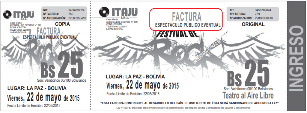 La impresión de las Facturas llevará la leyenda “ESPECTÁCULO PÚBLICO EVENTUAL” debajo del título FACTURA.
