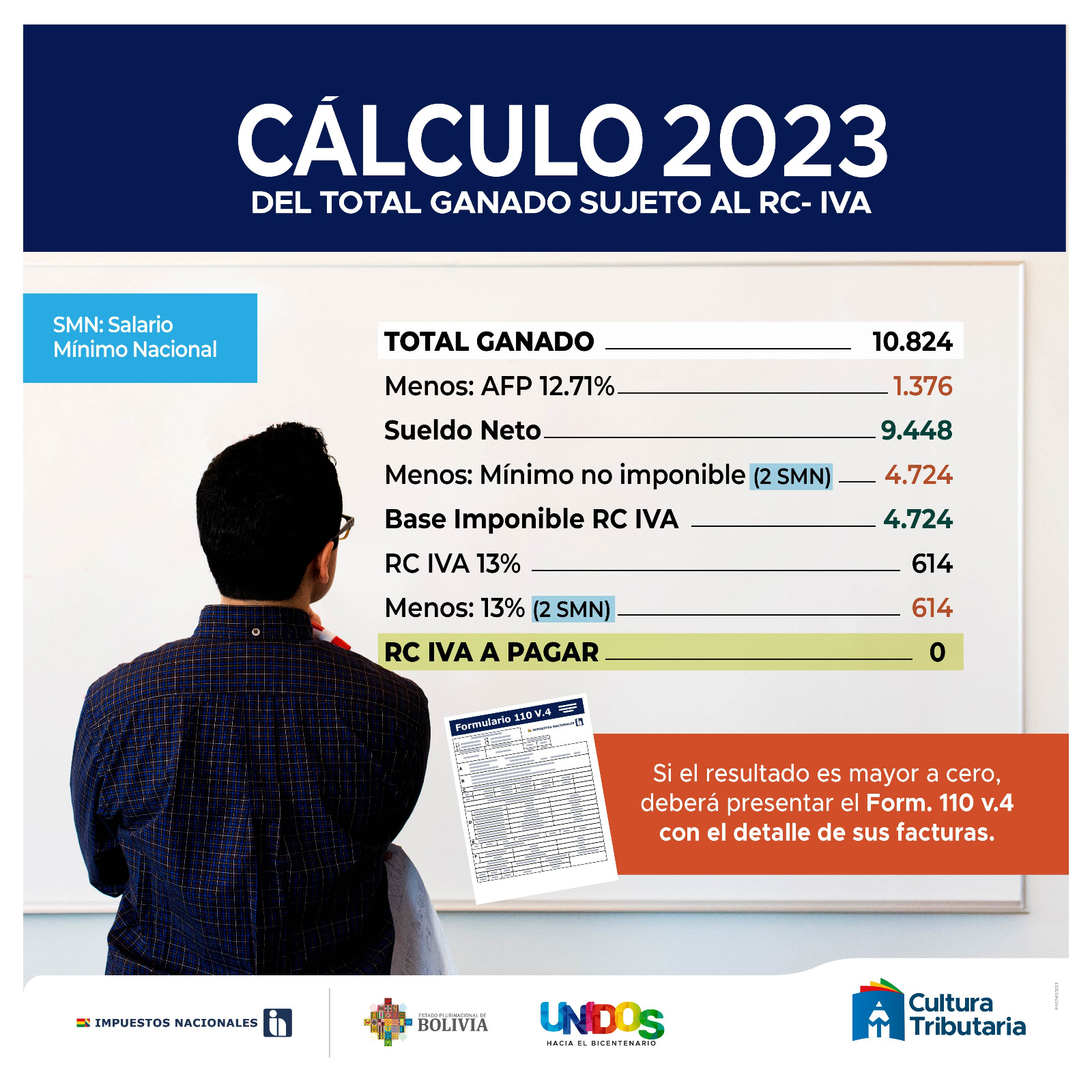 - La alícuota del RC-IVA es del 13%. En el caso de retener a empleados, solo se aplica si ganan más de 10,824 Bolivianos mensuales, un monto que varía anualmente según el salario mínimo nacional.