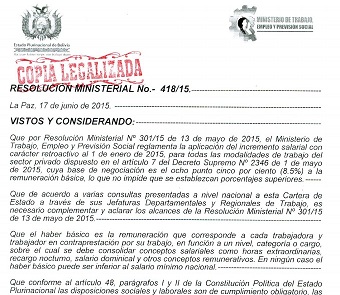 - 01/05/2015: DS 2346. Indica el nuevo salario mínimo para 2015 de Bs 1656 y un incremento salarial no menor al 8.5%. Retroactivo al 01/01/2015. Plazo 31/05/2015.