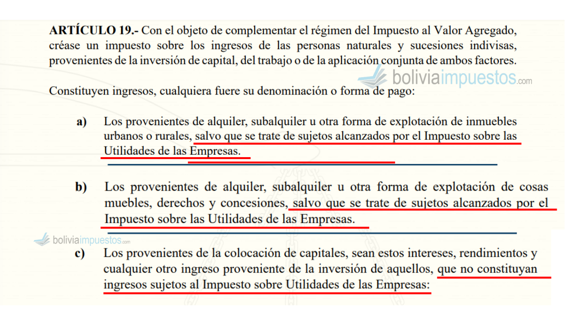 De acuerdo con el Artículo 19 de la Ley 843, los ingresos provenientes de la inversión de capital, del trabajo o de la aplicación conjunta de ambos factores están sujetos al RC-IVA, salvo que se trate de un contribuyente alcanzado por el IUE.