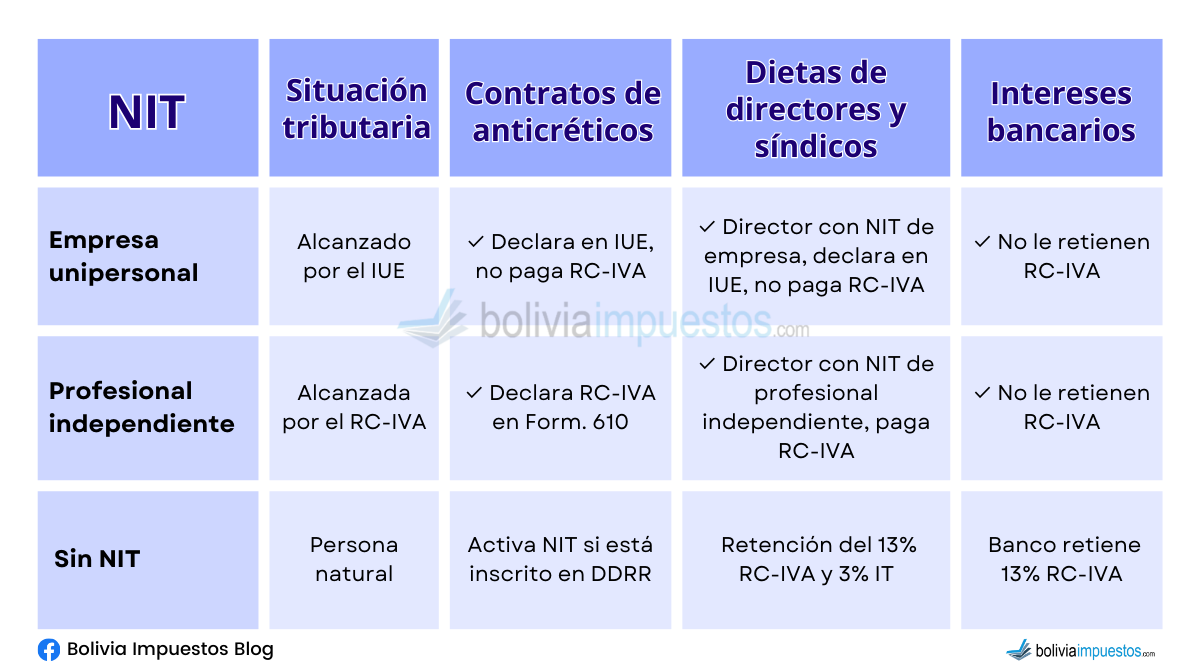 | Empresa unipersonal | Alcanzado por el IUE | ✓ Declara en IUE, no paga RC-IVA | ✓ Director con NIT de empresa, declara en IUE, no paga RC-IVA | ✓ No le retienen RC-IVA |