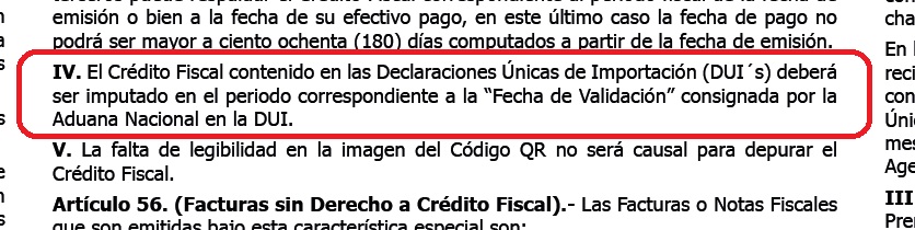 Art. 55. IV. El Crédito Fiscal contenido en las Declaraciones Únicas de Importación (DUI´s) deberá ser imputado en el periodo correspondiente a la “Fecha de Validación” consignada por la Aduana Nacional en la DUI. (Ver RND 10-0021-16)