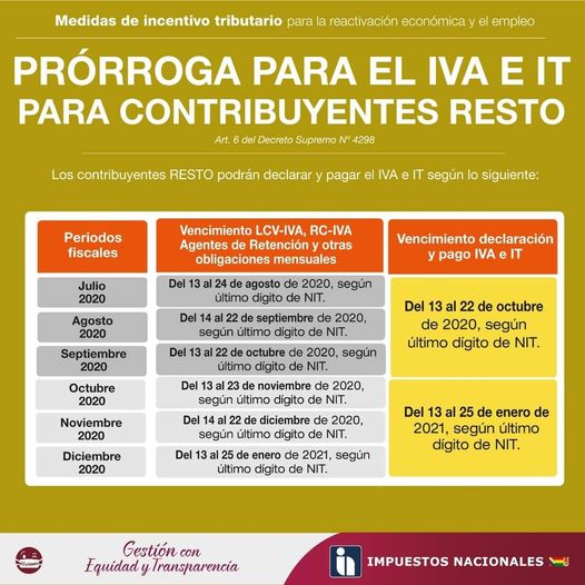 Por otro lado, el DS 4298 ha postergado, según su Art. 6, las declaraciones mensuales del IVA e IT (solo para contribuyentes RESTO, ojo):
