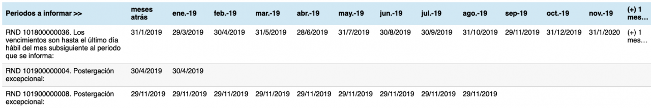 - GESTIÓN 2019. De Enero por ejemplo vence hasta el último día hábil del mes subsiguiente, o sea, marzo de 2019. Y así sucesivamente. En el cuadro mostramos sus postergaciones.