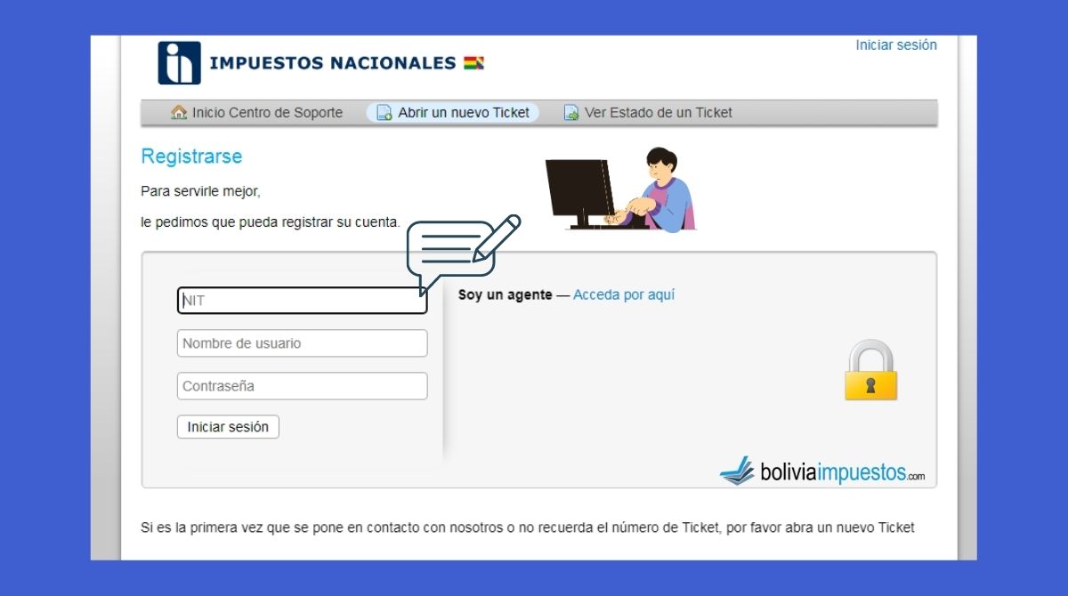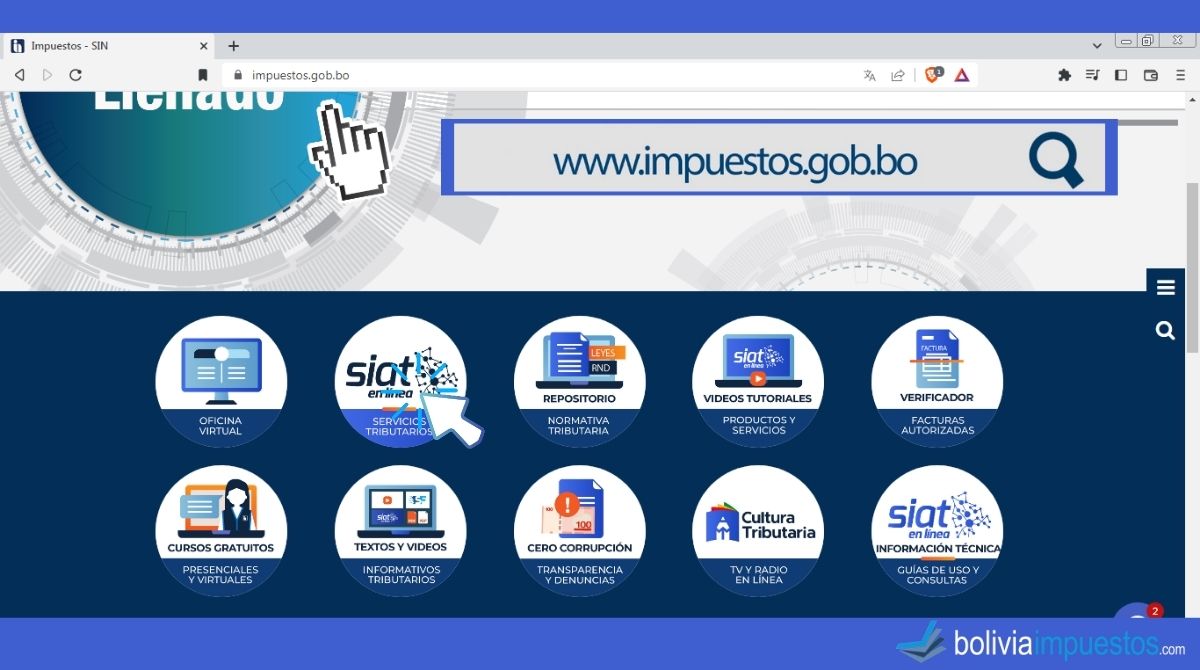 Para comenzar, Ingresa a la plataforma en línea del Servicio de Impuestos Nacionales (SIN) dirigiendote al sitio web oficial del Servicio de Impuestos Nacionales en Bolivia. Asegúrate de tener acceso a Internet y un dispositivo con capacidad de navegación.