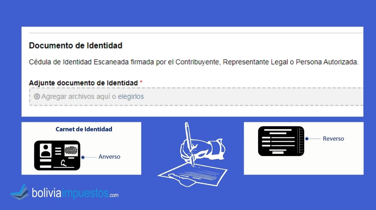 Como parte del proceso, se te pedirá adjuntar un archivo PDF que contenga el documento de identidad del contribuyente o representante legal escaneado. Debes firmar el documento en la parte central antes de escanearlo. Este archivo servirá como respaldo y confirmación de tu identidad como contribuyente o representante legal.
