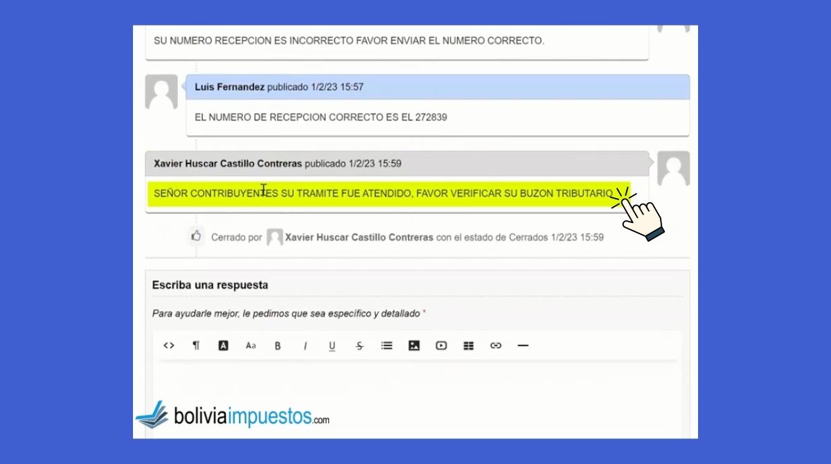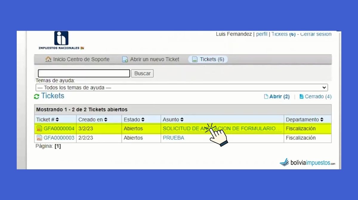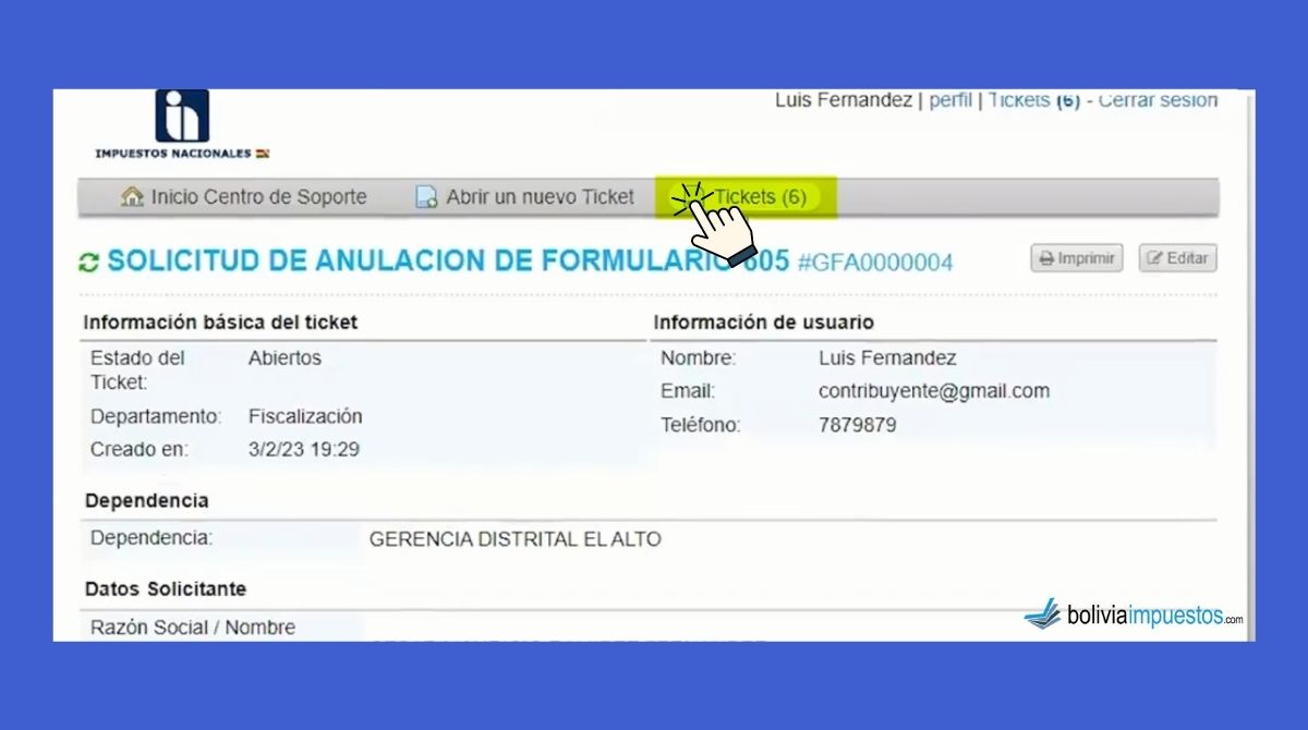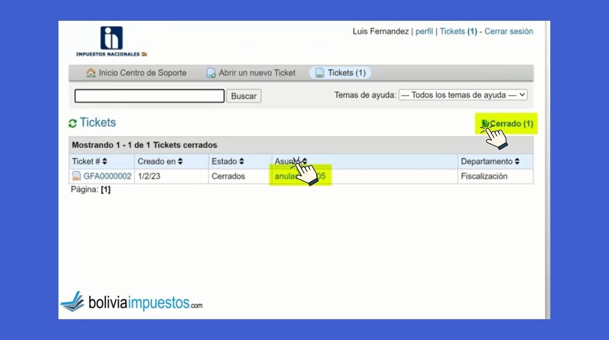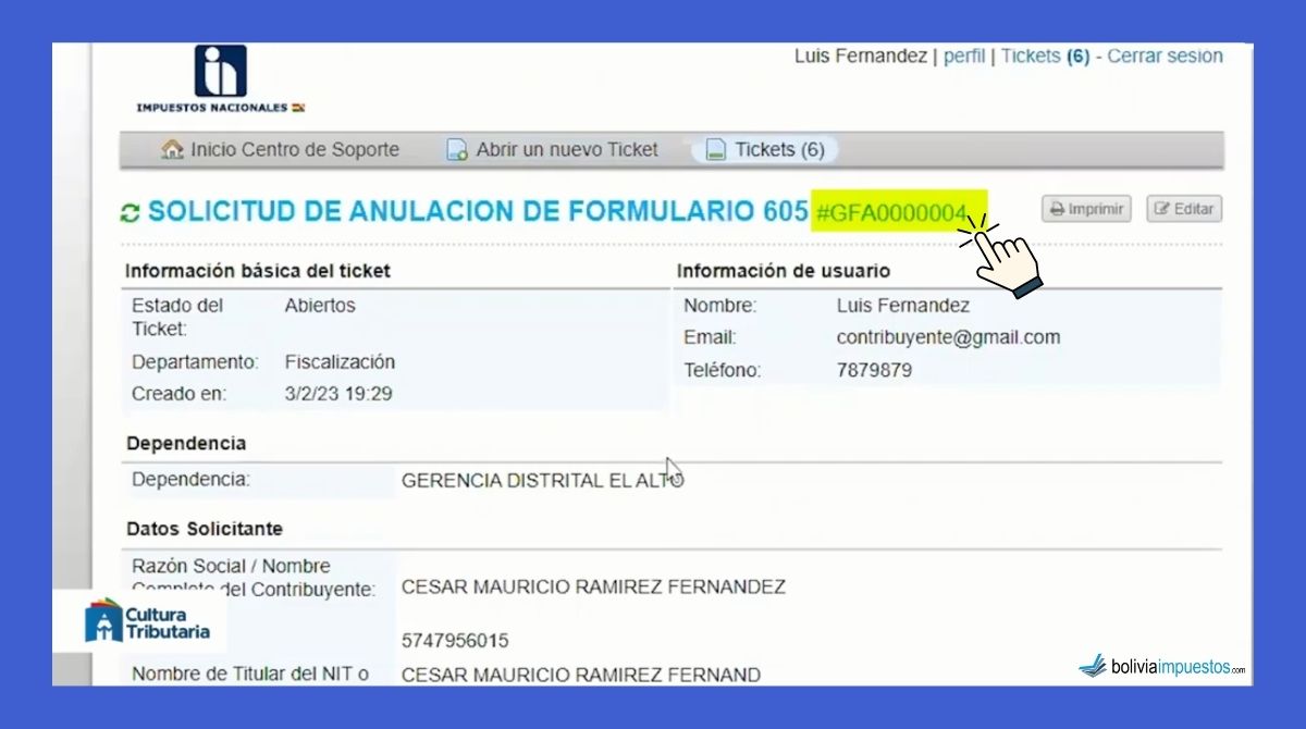 Una vez finalizado el proceso de tu solicitud podrás ingresar a «Tickets», hacer clic en «Cerrado» y posteriormente a entrar al asunto de «Anulación del Formulario 605». Donde se te notificará que el proceso de tu solicitud ya fue procesada y que la respuesta fueenviada al Buzón Tributario.
