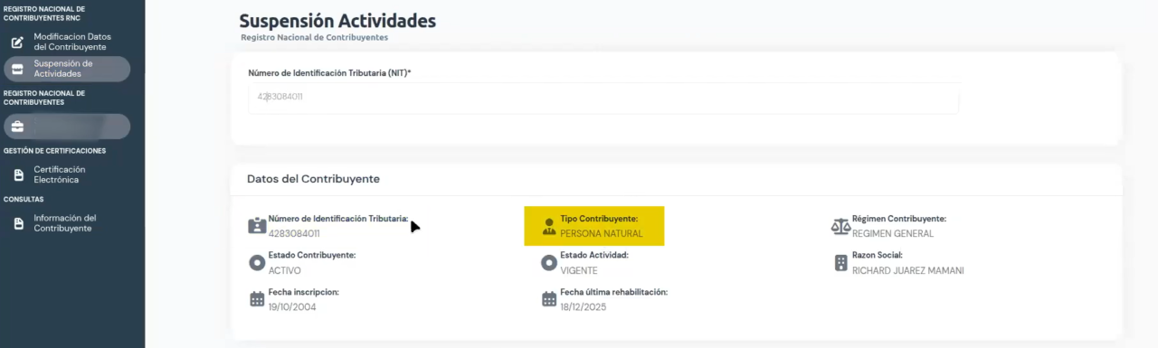 - En el menú izquierdo, pulsa nuevamente «Información del Contribuyente»
