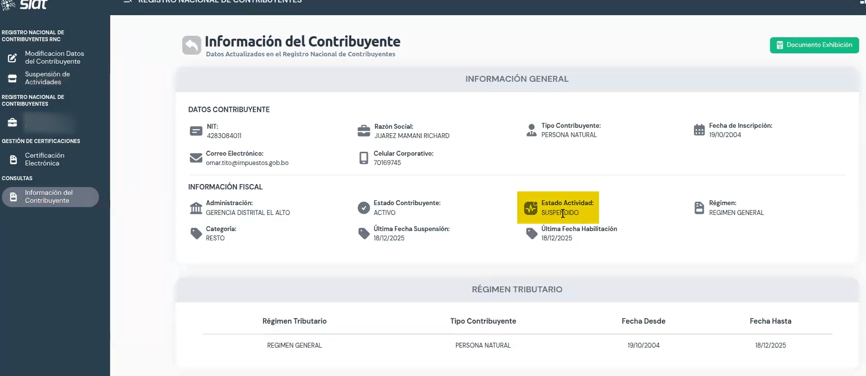 - Estado del contribuyente