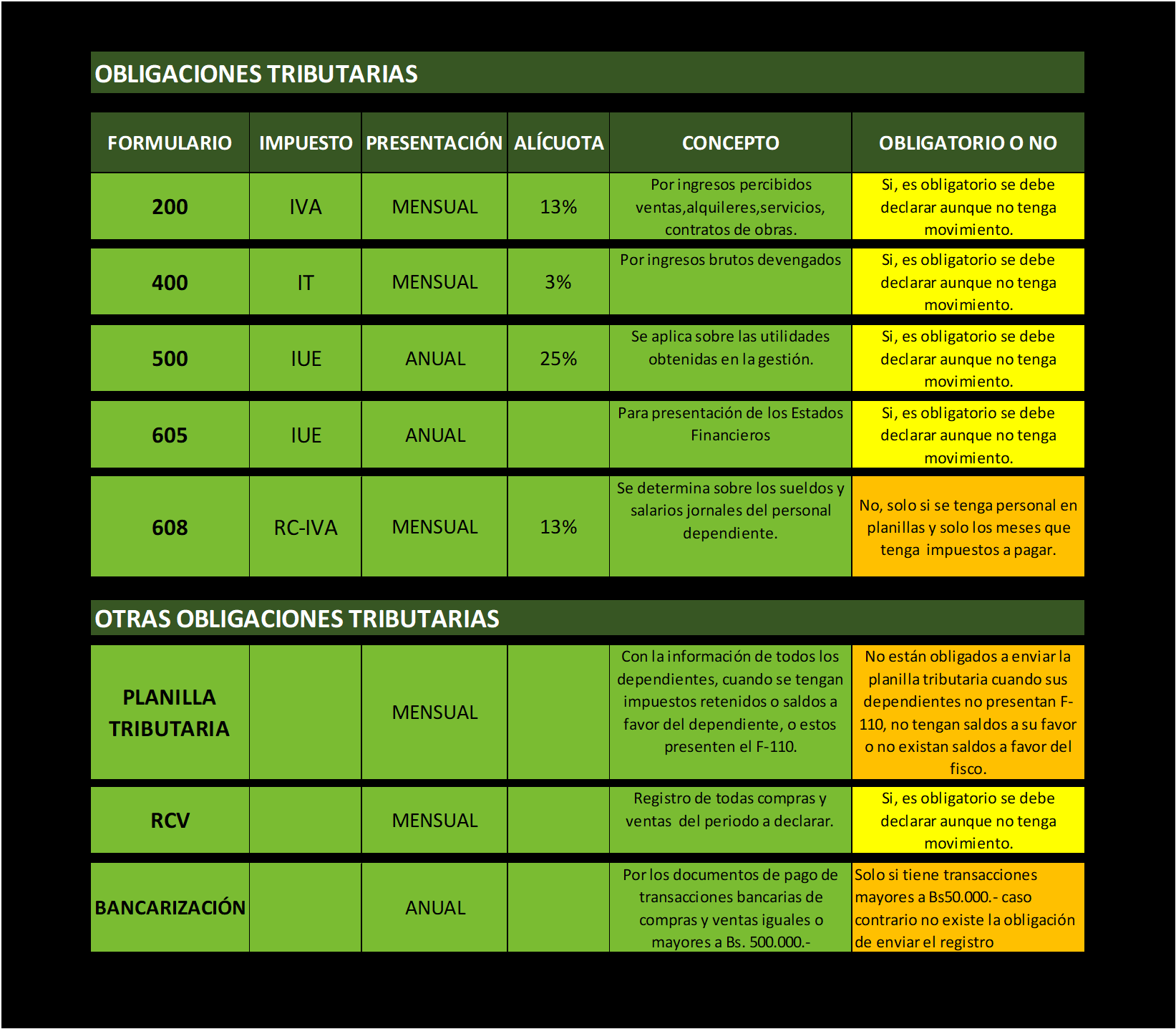Cuadro resumen de obligaciones tributarias